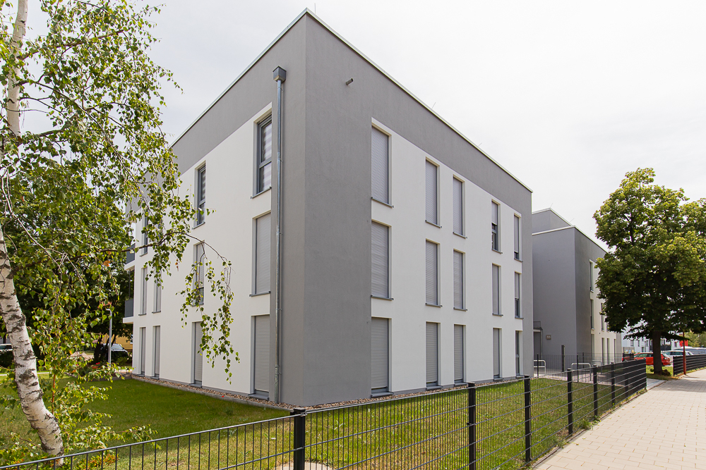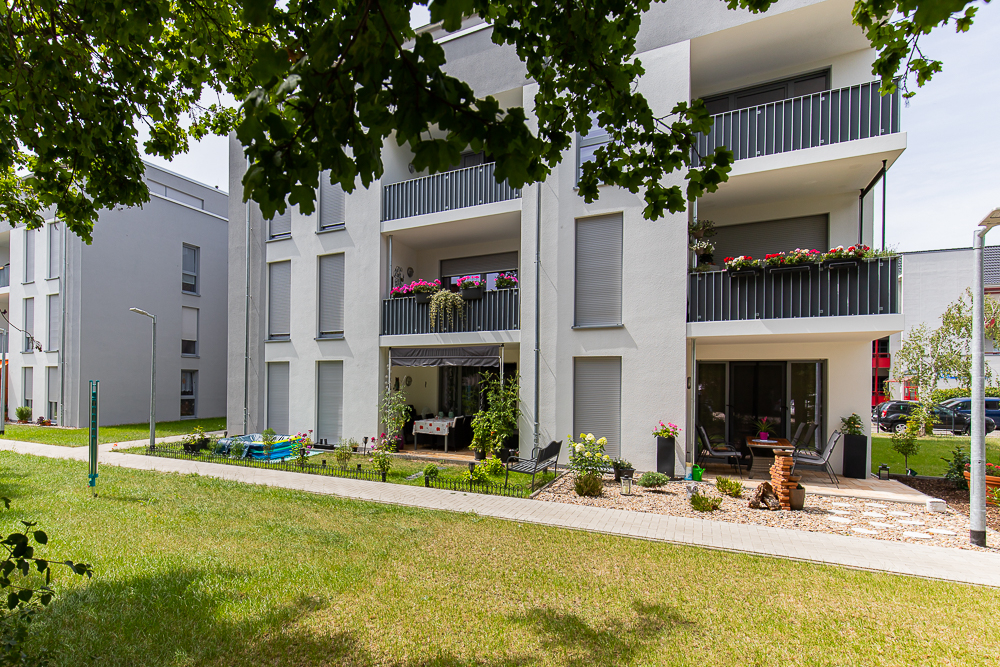 Ein parkähnlich gestalteter Innenhof schafft eine grüne und ruhige Atmosphäre innerhalb des Quartiers. Für die Bewohnerinnen und Bewohner steht außerdem ein gemeinschaftlich nutzbarer Fahrradschuppen zur Verfügung. Stellplätze und Garagen können bei Verfügbarkeit angemietet werden.